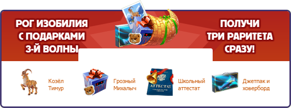Во всех текущих подарках можно найти рог изобилия с раритетами текущего этапа.