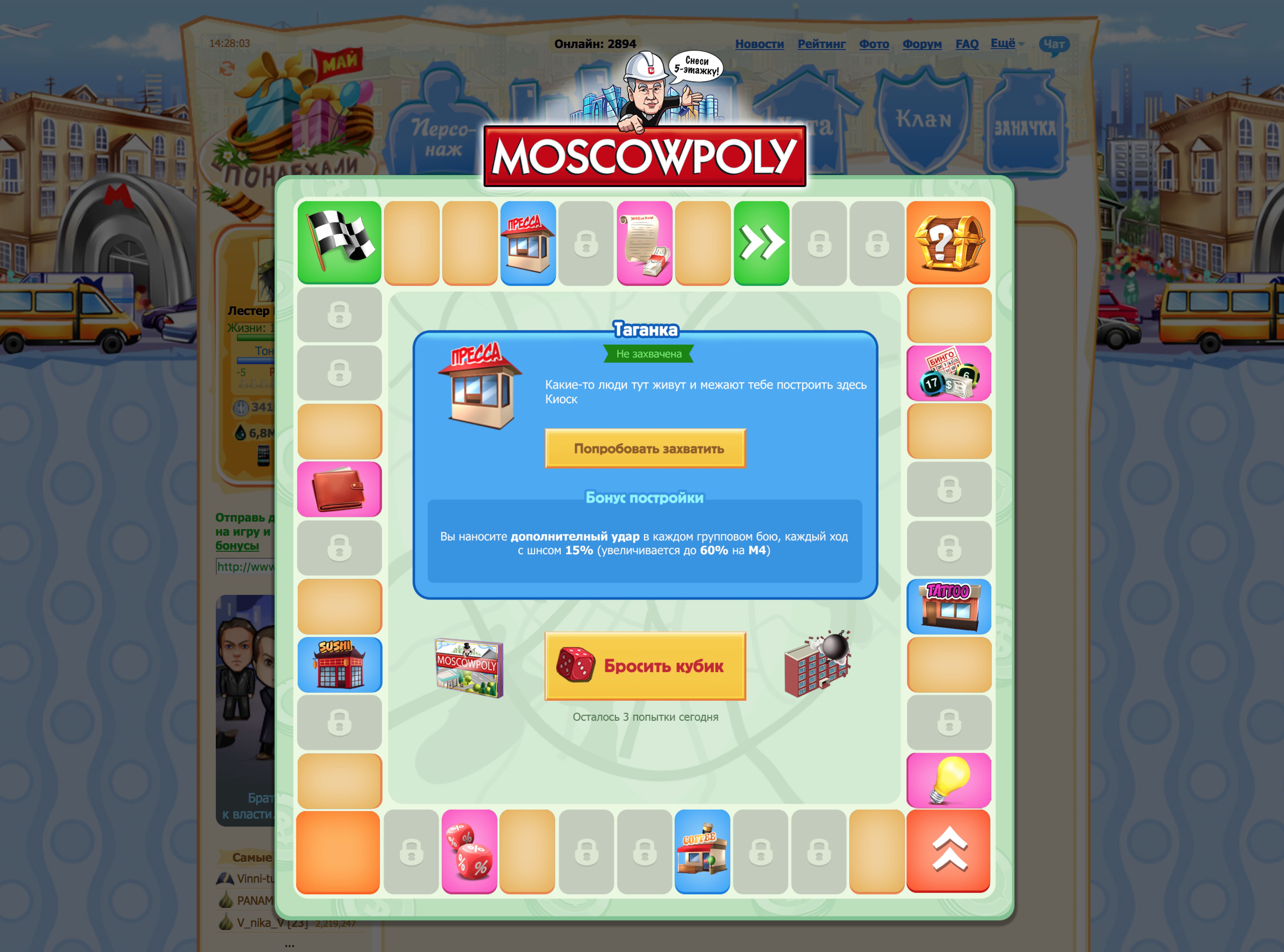 Каждый день можно бесплатно сделать три броска кубиков, причём дубль даёт дополнительный бросок! Ещё больше кубиков можно найти в подарках, чтобы получать максимальное количество бонусов каждый день! Будьте осторожны — три дубля подряд приведут вас в тюрьму за подозрительное поведение!