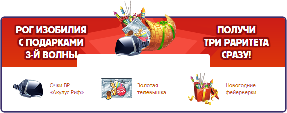Дополнительный подарок — это дополнительный шанс стать обладателем Рога Изобилия, который содержит отличные раритеты: 15 сертификатов на золотую телевышку, 31 коробка с очками «Акулус Риф» и 25 фейерверков для поиска раритетов под Ёлкой.